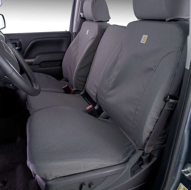 Help Protect your Seats with Premium Seat Covers from Covercraft. Seat protectors help shield your vehicles seat surfaces from wear, tear, stains and sun fade. Custom patterned for a perfect fit – no one-size-fits-all. Easy to install and remove for periodic cleaning. Breathable, heavy-duty polycotton fabric is not sticky like neoprene or vinyl seat covers. Durable water-repellant surface finish helps keep most spills from ever reaching the seats. Heavy-duty overlapped triple-stitched main seams for added durability. Map pockets in the back of most front seat covers to help reduce clutter. Protect your seats from everyday wear and tear with these truck seat covers. These seat covers feature a durable water-repellent surface made from heavy-duty polycotton fabric and triple-stitched main seams for durability.